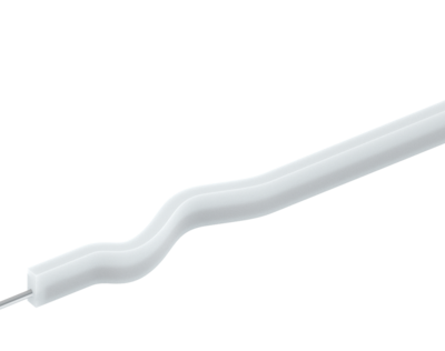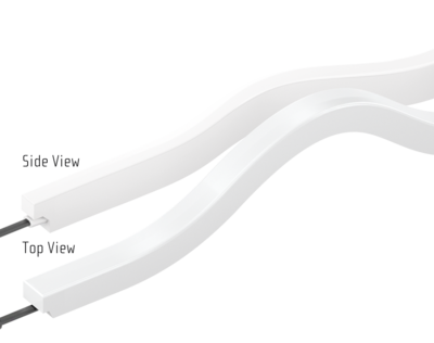 屋外建築の照明向けに、灯具末端まで均一に発光する、ドットレスの1方向の曲げが可能な照明器具(トップビューまたはサイドビュー)。